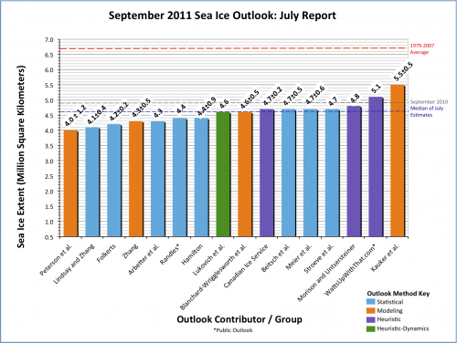 We appreciate the contributions to the July Outlook. We received 16 responses (Figure 1) with estimates in the range of 4.0 to 5.5 million square kilometers for the September arctic mean sea ice extent. The median value was 4.6 million square kilometers and the quartile values were 4.3 and 4.7 million square kilometers, a rather narrow range given the intrinsic uncertainty of the estimates on the order of 0.5 million square kilometers. Eight contributions span the range of 4.4 to 4.7 million square kilometers. The median is nearly the same value as from the June 2011 outlook, 0.2 million square kilometers below the 2010 July Outlook value, and 0.3 million square kilometers below the 2009 July Outlook value. It should be recalled that we are comparing these Outlook values to the September average sea ice extent as provided by the National Snow and Ice Data Center (NSIDC). NSIDC is not the only data source for ice extent; we use their value as an operational definition. If other data sources for sea ice extent are used, the corresponding mean monthly ice extent values can be adjusted by an offset to roughly correspond to the NSIDC value.