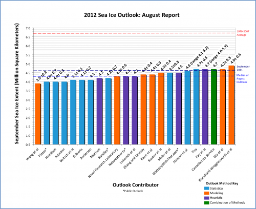 With 23 (thank you!) responses for the Pan-Arctic Outlook (plus 5 regional Outlook contributions), the August Sea Ice Outlook projects a September 2012 arctic sea extent median value of 4.3 million square kilometers, with a range of 3.9–4.9 (Figure 1). The quartiles for August are 4.1 and 4.6 million square kilometers, a narrow range given that the uncertainty of individual estimates is on the order of 0.5 million square kilometers. The consensus is for continued low values of September 2012 sea ice extent. The August Outlook median is lower by 0.3 million square kilometers than the July estimate, consistent with low summer 2012 observed values. According to the National Snow and Ice Data Center (NSIDC), the arctic sea ice extent for July 2012 was the second lowest in the satellite record behind 2011; the ice extent recorded for August 1st of 6.5 million square kilometers is the lowest in the satellite record. Twelve of the contributions give a value equal to or lower than the 2007 record minimum (monthly average) extent of 4.3 million square kilometers.