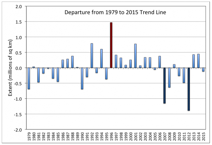 The September 2015 Arctic sea ice extent was 4.63 million square kilometers, based on the processing of passive microwave satellite data using the NASA Team algorithm, as used by the National Snow and Ice Data Center (NSIDC). This is the fourth lowest September ice extent observed in the modern satellite record, which started in 1979 (Figure 1). It is 1.87 million square kilometers lower than the 30-year average for 1981-2010 and 1.01 million square kilometers greater than the current record low September ice extent observed in 2012 (see Figure 1).