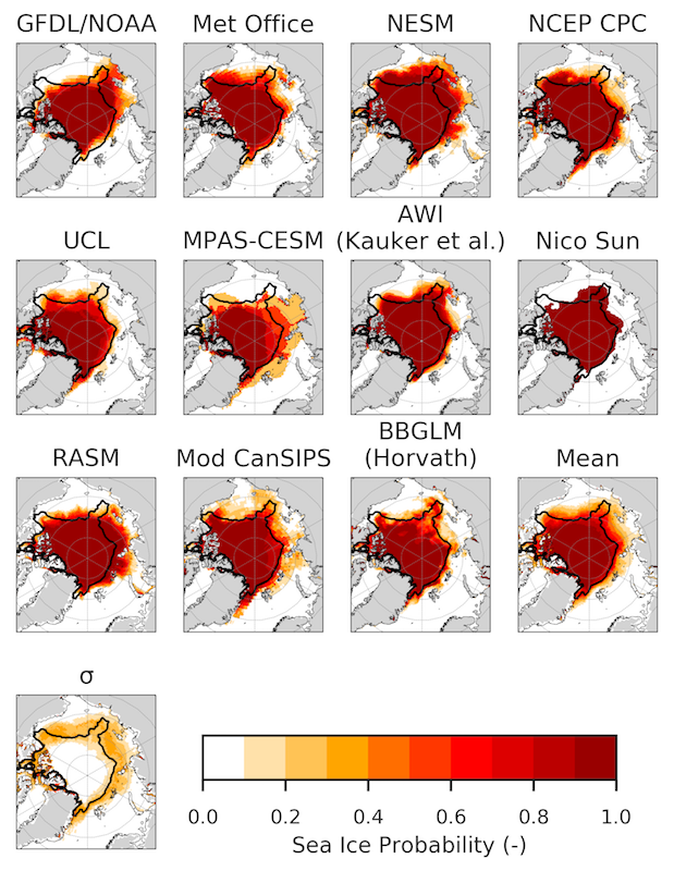 As has been done since 2014, teams were invited to submit forecasts of sea-ice extent probability (SIP – forecast probability of sea ice concentrations larger than 15%). This year a record number of SIP forecasts were received: 10 in June, 14 in July, and 12 in August. Figure 4 shows the SIP June Forecast, with the observed September sea-ice extent edge overlain, together with the ensemble mean of individual models' SIP, and the model uncertainty in the SIP forecast (as represented by the standard deviation across SIP forecasts).