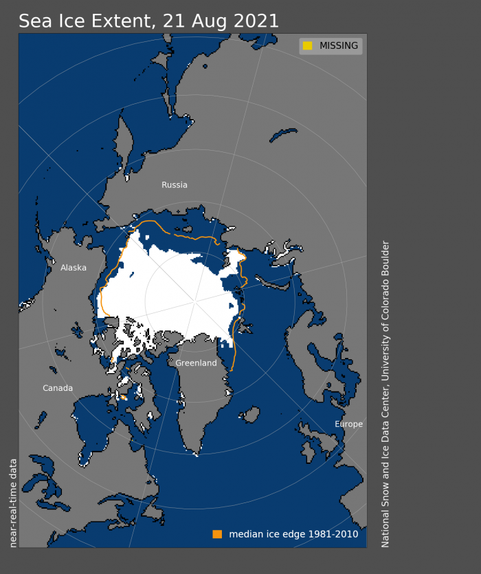 We heartily thank those who contributed to this 2021 August Sea Ice Outlook (SIO) report. This activity thrives only through the dedicated participation of the many forecast contributors. The 2021 August Sea Ice Outlook received 45 submissions (38 in June, 41 in July). These outlook contributions are based on various methods, including dynamical (physics-based) models, statistical approaches, heuristic (qualitative), and machine-learning. Along with projections of total Arctic sea-ice extent for September, the August SIO received nine projections of Antarctic total ice extent (eight in the June SIO and seven in the July SIO) and nine projections of ice extent in the Alaskan sector, which combines the Bering, Chukchi, and Beaufort seas (seven in the June SIO and eight in the July SIO). Sea-ice probability (SIP) forecasts from ten models and eight first ice-free date (IFD) are included in the August 2021 SIO. New in 2021, the SIO solicited September mean Arctic sea-ice extent anomaly forecasts and received 15 in August (14 in the June SIO and 14 in the July SIO).