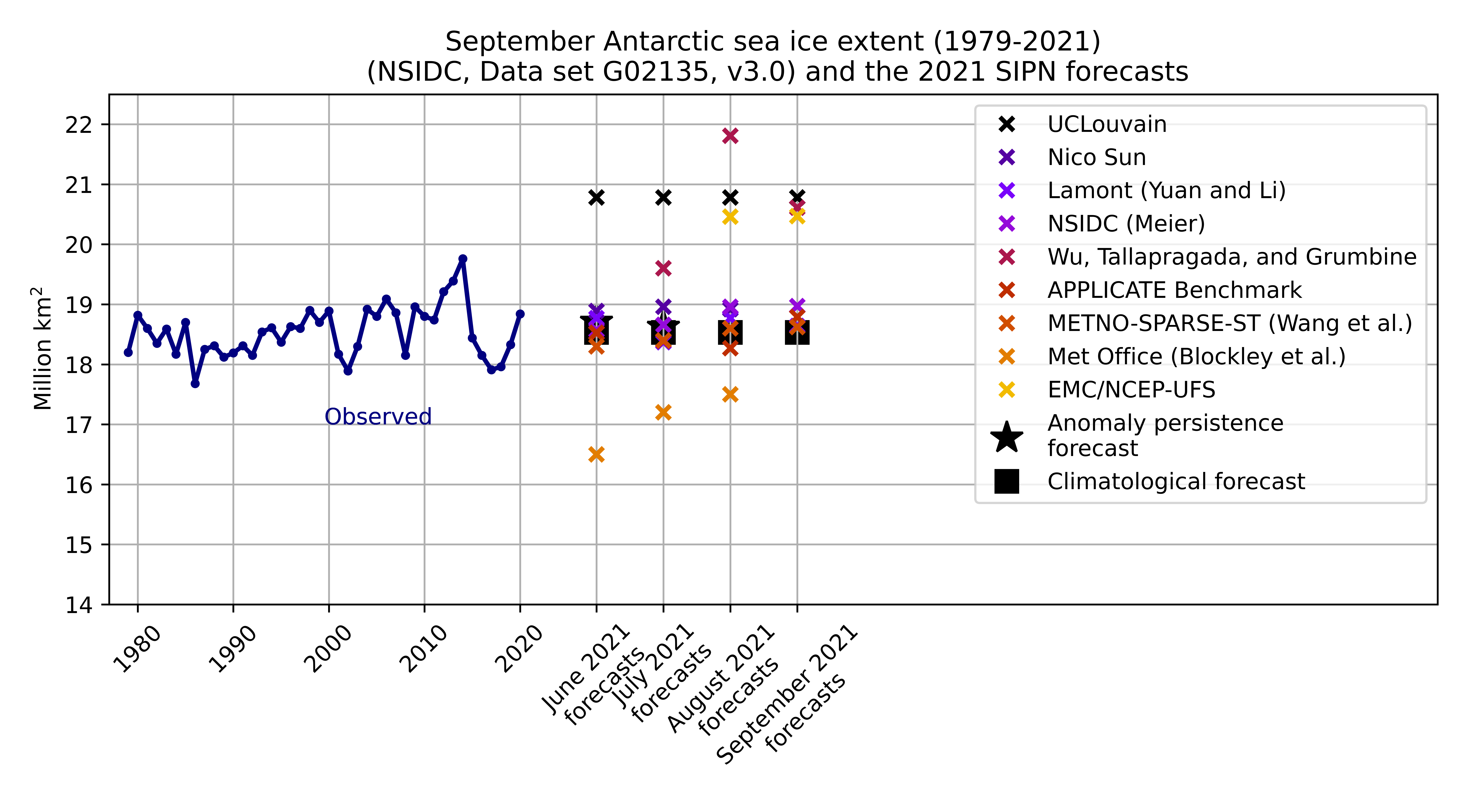 For this new round of September-based outlooks, six updates were provided from the previous outlook (a seventh outlook uses the values of June). The pattern that has been observed in the previous round of forecasts remains, with a cluster of forecasts that use statistical approaches and several forecasts based on dynamical modeling. Because of the short lead time, it is likely that the actual September mean sea-ice extent will be closer to the mean of the statistical group than of the mean of the other group.