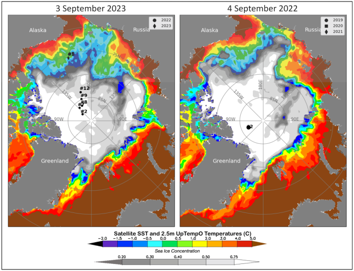 Overall, the end-of-summer sea surface temperature (SST) pattern in 2023 was quite similar to 2022 (Figure 7). However, in the Beaufort, Chukchi, and East Siberian Seas, ice retreat was earlier in 2023 relative to 2022, with resulting warmer SSTs and greater ice retreat. The East Siberian Sea is an interesting case, in that its ice retreat is generally late every year, but with variability that allows for some end-of-summer years with extensive ice cover (e.g., 2022) and others with completely open but quite cold SSTs (e.g., 2023).