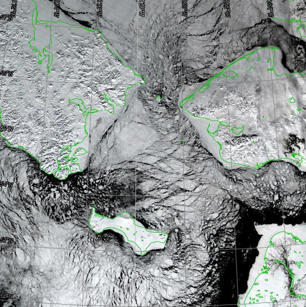 Satellite imagery shows the sea ice around St. Lawrence Island to be made up of numerous broken floes of all sizes. The ice appears thin with many areas of open water leads, and new, young ice just offshore of the expansive shorefast ice, especially along the south side of the island. Conditions are similar along the north coast between Gambell and Savoonga, but the shorefast ice between the two towns is very narrow. Shorefast ice east of Savoonga extends out many miles offshore. Current wind conditions continue to favor the loose pack south of the island.