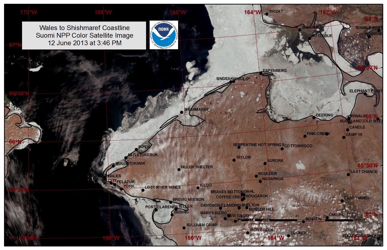 The southern Chukchi Sea has also experienced a major seasonal melt of the ice pack this past week. The Bering Strait and southern Chukchi Sea up to roughly 68ÂșN are mainly open water with the remaining ice located near the shorelines. Shorefast ice is still present along part of the coast with the ice extent varying from 14 miles off Ikpek to 6 miles off Mugisitokiwik. Ice within the bays and north of Shishmaref is no longer shorefast. Beyond the outer edges of the shorefast ice lies an area of close pack ice 5 to 15 miles wide that is moving along the shorefast ice edge as the fast ice continues to become unstable.